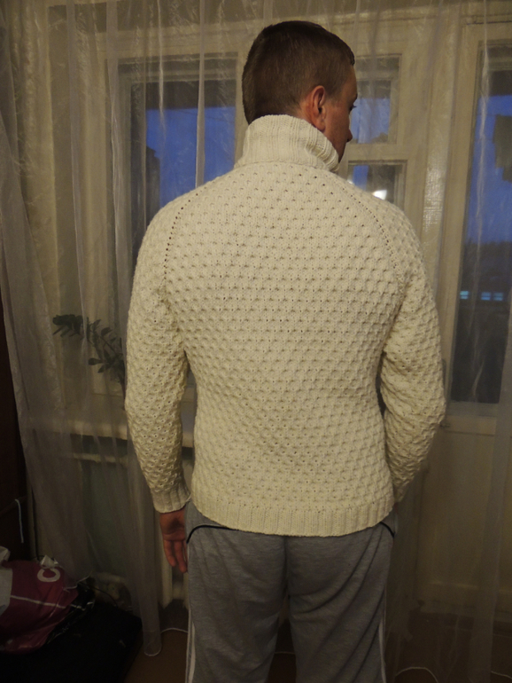 если не против-немного критики. резинка слабовата(по крайней мере спереди волной), рукава коротковаты и реглан впереди немного узковат- разделить надо было немного по-другому. а вообще связано неплохо и узор суперский