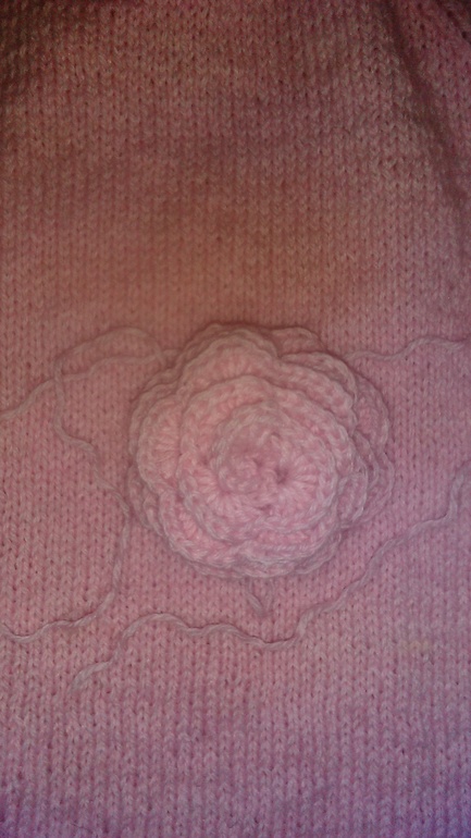Связала себе джемпер с косой на спине, а перед лицевая гладь. Но чего то не хватает. Связала цветок, что- то он потерялся. Вот теперь думаю, что можно сделать.фото пот кат