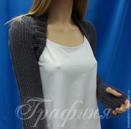 Вязала летом дочке болеро.Думаю,это связано по тому же принципу.Вязание скорее всего начали от низа первого рукава вкруговую,довязали до подмышки(наверно немного прибавив петель для расширения) и дальше вязали спинку прямыми рядами туда-обратно.Достигнув того места,где нужно начинать вязать второй рукав,снова вязали на круговых спицах,убавляя петли по ходу вязания в том же порядке,что прибавляли при вязании первого рукава.Потом обвязали болеро по краю резиночкой.В подобных моделях часто обвязка бывает широкой и кружевной.Получается красивая оборка по низу,а сверху она как красивый воротник.