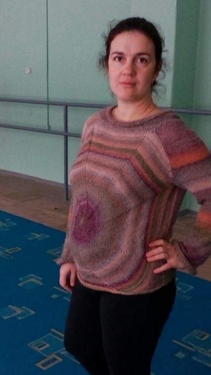 Ничего подобного я еще не видела)) Интересная модель) Сама придумала это солнышко спереди?) Тебе идет этот цвет и фасон. И выглядишь прекрасно, постройнела и помолодела!)