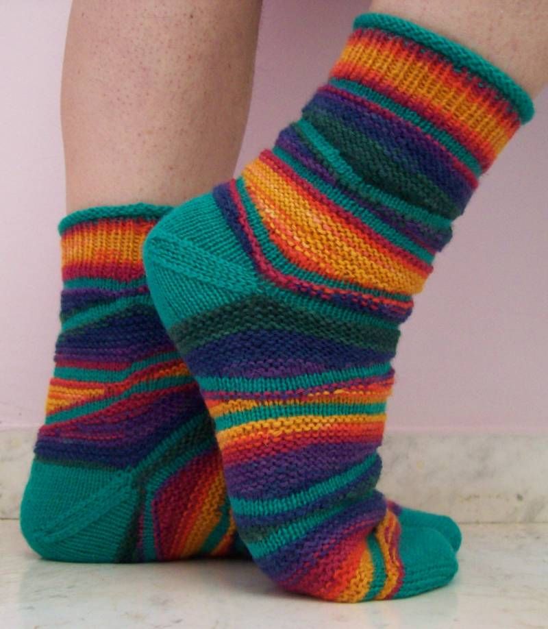 Пестрые узоры из разноцветных ниток благодаря своеобразной Твист-технике - вязание укороченными рядами. Техника частичного вязания или вязания укороченными рядами позволяет создавать модели с уникальным кроем..Вязание укороченными рядами предполагает не полное провязывание ряда от начала и до конца, а вывязывание только части ряда. Его можно выполнять с одной или обеих сторон полотна, внутри и по краям, по лицевой либо изнаночной стороне изделия.Носки связанные этим способом являются настоящим произведением.Помочь разобраться в новом способе укороченных Р. поможет предлагаемый мастер-класс с пошаговыми объяснениями . Смысл метода состоит в том, что кривая линия, скос или выпуклость на полотне происходит за счет вывязывания неполных рядов без убавления и закрытия петель спицами.