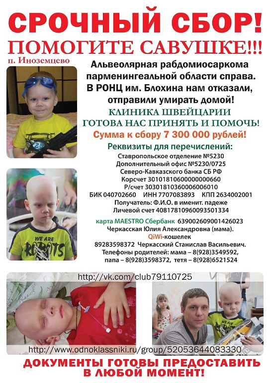 http://odnoklassniki.ru/summaksb/albums Всего собрано:2 365 559,30 руб. Осталось собрать 4 934 440,70 руб. Спасибо всем огромное дорогие наши и низкий поклон вам до земли!!!