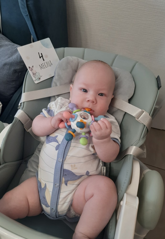 4 месяца моей сладкой конфетке 🥰. 7400 кг и 64 см💪. Компанейский будет парень,разговаривает без умолку,даже засыпая 😁. Счастья всё больше,а времени у меня всё меньше.Крутится,переворачивается,лежать не хочет,шилопоп 😊.Глаз да глаз сейчас за ним нужен.То ли ещё будет 🙈. Чудо моё любимое 💕.