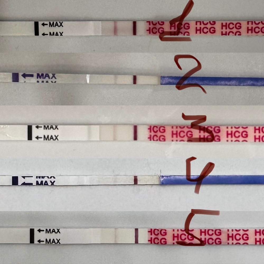 Значит, укол овитреля был 17.11 в 19.00. Сегодня 7,5 суток после него и 5дпп. Полоски за 5 дней выглядят так