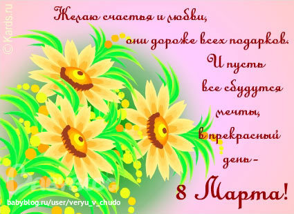 Kissyna в ЭКО-мама 13 лет С наступающим нас, ДЕВОЧКИ! Желаю вам всего, чем жизнь богата: Здоровья, счастья и любви! Пусть этот праздник - день 8 марта В душе оставит добрые следы! А все кто в протоколе, получат заветные две полоски!!!! Посмотрите еще 20 записей на эту тему Отменить Ответить Катерина 07.03.2013 Ответить Ёлка (была с аватаркой-нюшей) Присоединяюсь к поздравлению)))) 07.03.2013 Ответить Jellinka Ксюша, и тебя с наступающим!!!! легкой беременности и родов! Ляльку тоже поздравляй, нашу маленькую девочку 07.03.2013 Ответить Лана с 8 МАРТА 07.03.2013 Ответить поздравления с ДР))) Уреаплазма перед протоколом, что делать? Чаты Беременных Выберите чат: Январята-2026 Февралята-2026 Мартята-2026 Апрелята-2026 Майчата-2026 Июнята-2026 Июлята-2026 Августята-2026