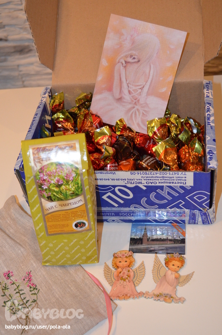 Фотогалерея (Наши пузики и детки)Наконец-то пришла моя посылочка из Москвы от Мимозки Юлия (ава ежик) (не нашла аву, я как обычно туплю)))!!! Вот что в ней было: целая гора вкуснячих конфеток, чаек с чабрецом, магнитик "Москва", открыточка и очень бережно завернутые в отдельную коробочку два магнитика - ангелочка- такие нежные и милые, символ моих будущих деток наверно))))). Спасибо тебе большое, моя Мимозка Юля, праздничное настроение возвращено, удовольствие и эмоции получены!!!!!!