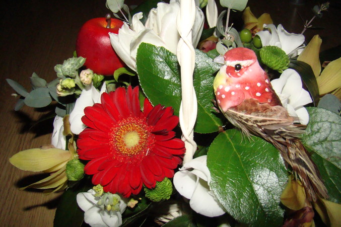 Привет от любимого! Корзиночка с цветами ) декоративненькая птичка и 2 яблочка))) на фото правда получилось одно) второе за кустами не видно.