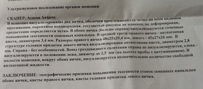 Мужской факторДевчонки,всем приветик. Вот отправила мужа на узи и даже не знаю что и думать по результатам. В интернете особой инфы нет. То что киста,пишут что и не удаляют ее. Эти результаты могут влиять на способность производить потомство?)