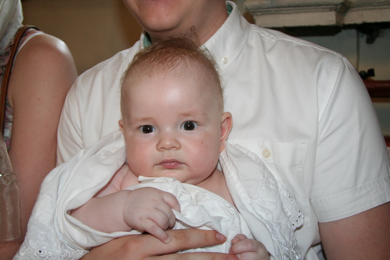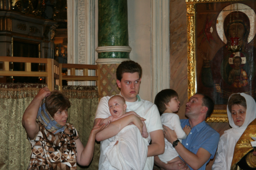 И тут началось наше мирное , чинное и благородное таинство. Наш дядя был в золотом платье, мне он из-за этого намного больше понравился. На трясущейся от моих 9 кг руке брательника мне было клево, я зевал, разглядывал окружающие меня золотинки, картинки и изредка подпевал дяде в золотом платье. Потом он вытащил у меня изо рта кулак , помазал его кисточкой и попросил меня обратно его себе в рот не вставлять пока что...брательник меня резко скрутил и от этого у меня чуть не онемела рука. Я недовольно крякнул. Бабушка перепугалась и начала мне резко пихать в рот соску, по началу я ее интеллигентно выпихивал языком, но на 5 раз сопротивлений я громко и внятно крякнул матом на всю церковь. От меня все отстали и я продолжил свои позевушки и разглядушки.