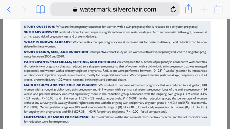 Это на английском и касается двойни, но вероятность потерять всю беременность значительно выше у женщин, сделавших редукцию.