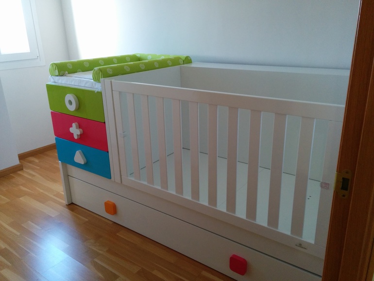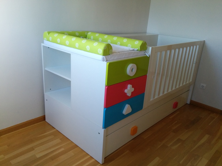 Кровать-трансформер (на вырост), сейчас только пеленальником пользоваться будем, а потом чуть подрастет и будет там спать, потом решетку заменяют просто бортиком, потом вся верхняя часть трансформируется в стол, тумбочку с 3 цветными ящиками и еще одну тумбу под стол (те 2 полки слева). Сверху остается кровать длинной 2 метра, а снизу и сейчас и потом еще одна кровать для гостей.У нас тут большинство такие кровати покупают.