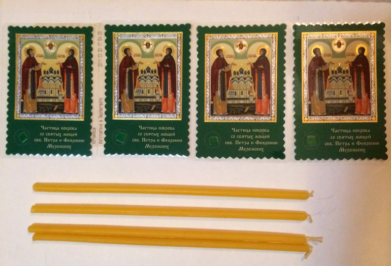 Иконы Петра и Февронии были освещены у их мощей. В иконы вкреплена частичка с мощей самих святых Петра и Февронии. К иконкам также отправлю по свечке.