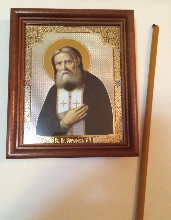 И икона Серафима Саровского, из Дивеево. Также со свечкой, которая была зажжена от лампады у мощей Серафима Саровского.
