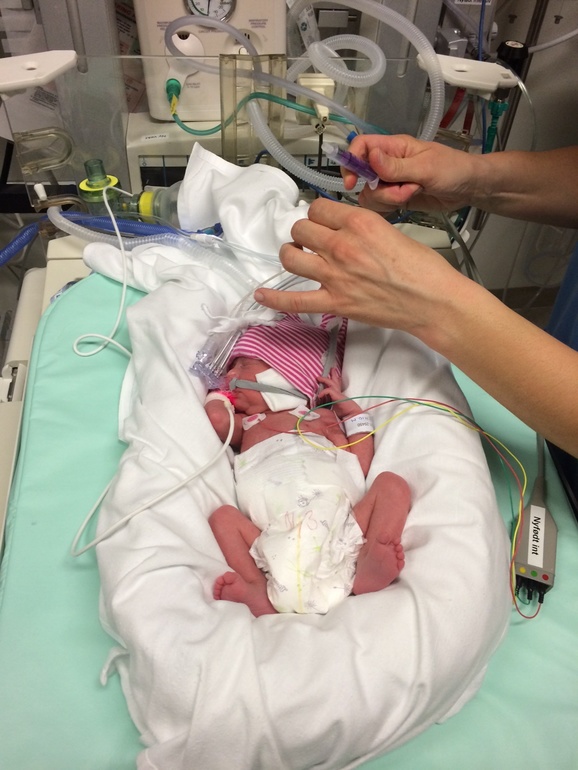 И мы поехали, я лежала на этой катящейся кровати и считала секунды. И вот мы в отделении реанимации для новорожденных. Все-таки хрошо, что мы тогда сходили сюда на экскурсию. Не так страшно и немного понятнее что это за штуки вокруг и вообще где что. Закатили меня в общее помещение, где стоят кювезы с детками. Я увидела кювез с Верой и саму ее. Мою крошечку. Всю в трубках, датчиках. Даже личика не видно из-за ивл. Муж мнимал нашу первую встречу на видео. :)