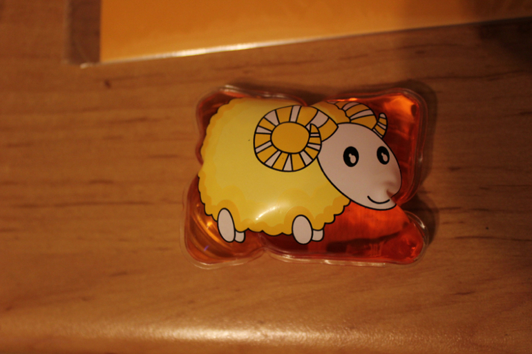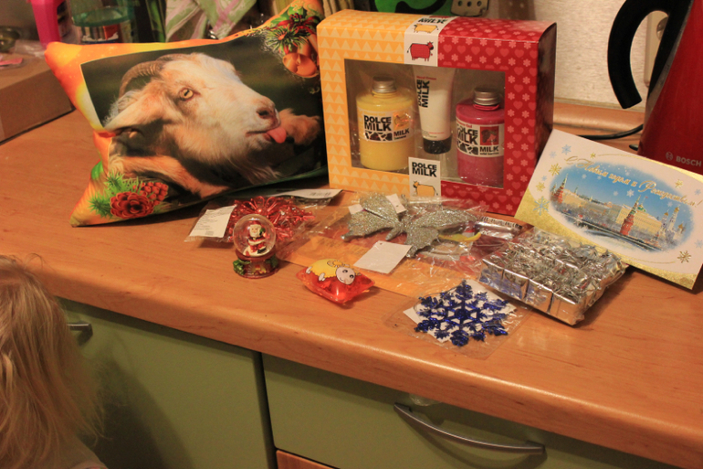 Тут и для мамы "вкусные" гели для душа, папа наш сразу предъявил права на подушечку с козой, много елочных игрушек, календарь, октрыточка с прекрасными пожеланиями и милый пакетик для душа с овечкой :)