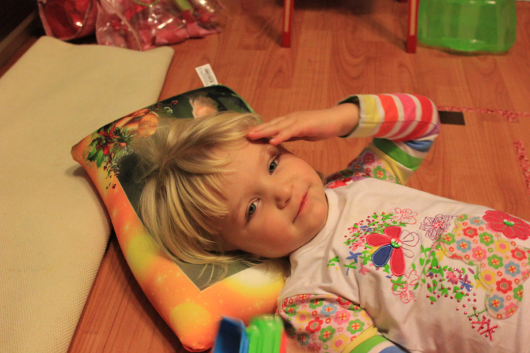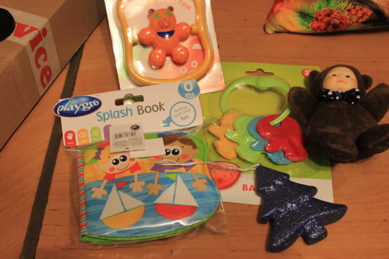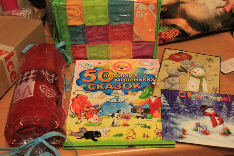 А потом целый калейдоскоп подарочков: суперское полотенце, книжечка со сказками и прекрасными иллюстрациями Сутеева, елочные украшения, девочкины приблуды (заколочки, ободок), погремушки и книжка для ванной, а также мягкие кубики. Все быстренько разобрали и попробовали.