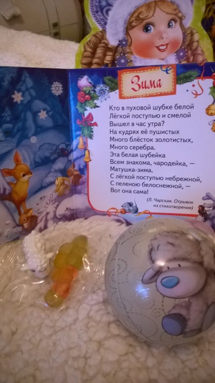 Открытка, с милыми пожеланиями, чудные новогодние салфеточки и маленький дождичек (они уже на следующий год), оооочень нужный нам грызунок -погремушка (все что можно грызть для Инны сейчас идет на ура!), забавный шарик на елкус мармеладкой и игрушкой внутри, прекрасная книжечка с зимними стихами - полезная вещь! И главное, что нам очень пригодится, это наклейки на стену, как раз в нашу новую квартиру, где у Иннульки будет своя комната, и набор Русалочка от Диснея для мыла и зубных щеток, что тоже очень пригодится в новую квартиру (да-да, свой туалет у Инки тоже будет