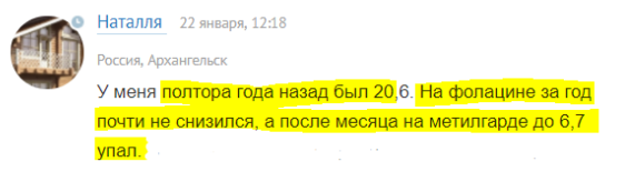 Гемостаз (+ИГ и ЛИТы)Девочки, давно хотела поделиться своим опытом по снижению высокого гомоцистеина, что относится к одной из форм тромбофилии. Читала у многих, что в основном, снижают его ангиовитом, в котором содержится высокая доза фолиевой кислоты, 5 мг. Я же снижала его активной формой фолиевой кислоты, или метил-фолатом. Пока тут о нем рассказов не видела, и вот хочу поделиться, может кому пригодится, особенно таким как я, "мутантам" с MTHFR. Я снизила гомик до 5,9 с 11,3...