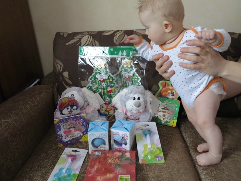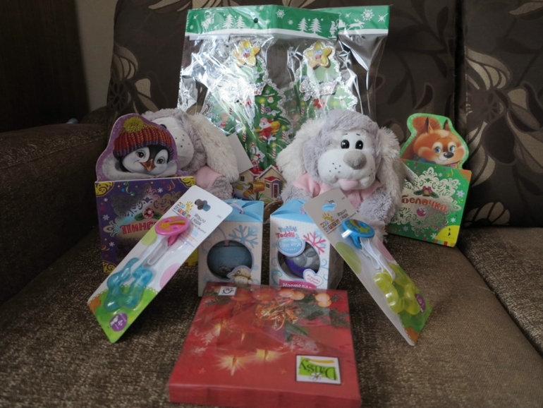 Тамарочка, спасибо огромное за такие отличные подарочки, и все в двойном количестве: плюшевые, очень мягкие песики, дети в них зарылись сразу по уши, замечательные книжки, которые вызвали мгновенный интерес)) дети и сейчас слушают стихи из них и, конечно же, с удовольствием грызут)), нвогодние панно-елочки, праздничные салфетки для стола, елочные шары с сюрпризом и мармеладкой и грызунки на прищепках, которые у нас стали просто хитом.