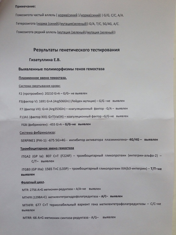 У тебя две гетерозиготы фолатного цикла. Гомоцистеин будет высоким. Следить надо и снижать его фолькой несколько месяцев перед протоколом. В беременность тоже. Если очень большие значения, до доза фолиевой превышает обычные 5мг.Паишная в гомозиготе. Не так часто встречается. И две гетерозиготы по генам привычного невынашивания. Все не смертельно, но готовиться к переносу надо с гематологом. Вероятнее, лучше подсаживать в крио. Клексан скорее всего будет назначен сразу же.
