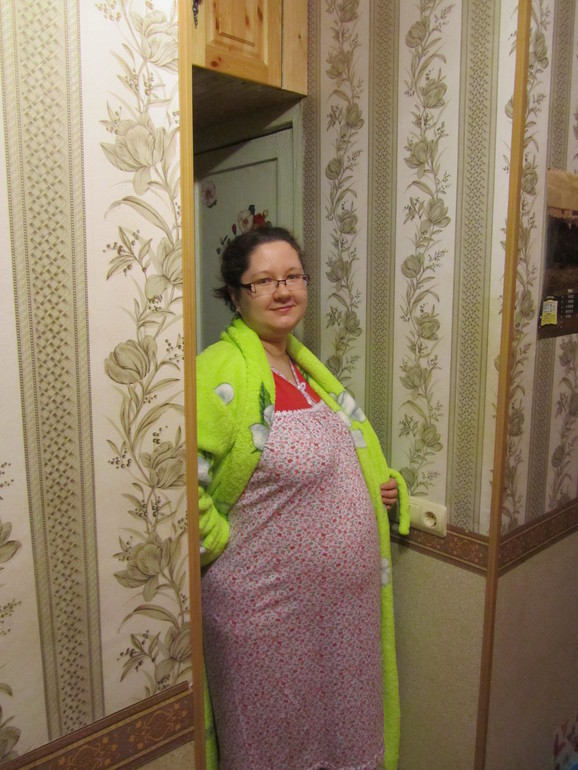 Ну и фото пуза. Собирала вещи в больницу, а муж с вытаращенными глазами и криками "Ты точно беременная!!", бегал и фоткал. (Какая я круглая, поняла только глядя на себя в этом халате. )