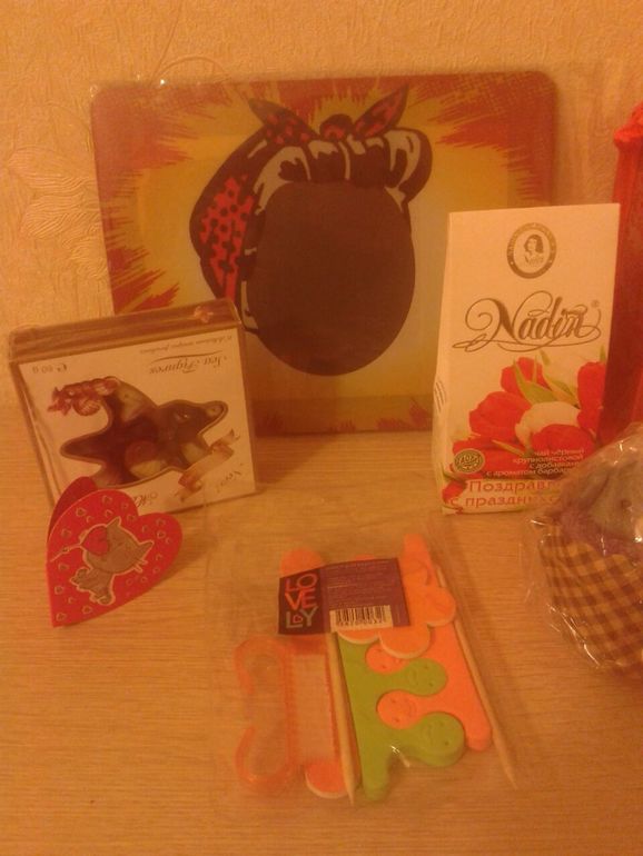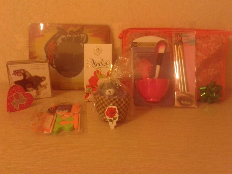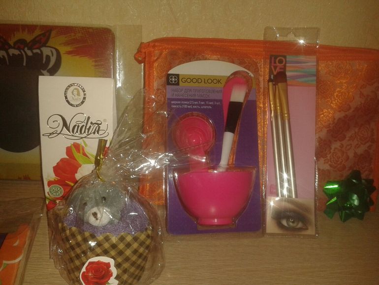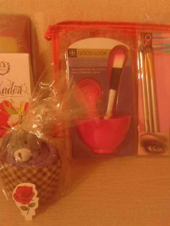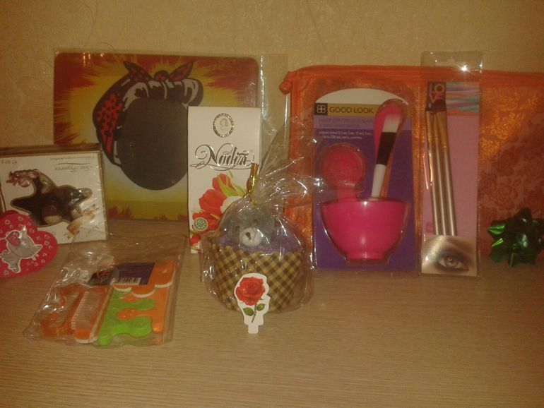коврик для мышки, в кот можно ставить сове фото, первый раз такой вижу, очень порадовал, вкусненькие конфетки, кот я тут же с чаем и попробовала, набор для приготовления масок(мисочка, лопаточки и кисточки) тоже такой удобный, еще не пользовалась но начну!!!, кисточки для макияжа очень актуально, маникюрный наборчик, полотенце в виде игрушки мишки, очень ароматный чай, малентькие валентинки и красивое пожелание!!!