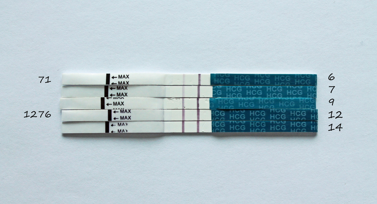Разглядываем тесты // пока ждём результат ХГЧДевчата, всем привет! Напоминаю, что 18.03 мне перенесли двух пятидневочек, сегодня уже 14 ДПП. Самочувствие полностью нормализовалось, я бодра и весела, очень жду первого УЗИ, которое назначено на 06.04. Прилагаю фотографию с моими тестами: цифры справа означают дни после переноса, числа слева - ХГЧ. Как видите, сегодняшняя полосочка полностью сравнялась с контрольной, не отличить.