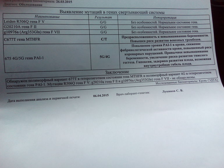 ой, у меня точно такое же заключение, смотрю как на свой лист))) мне врач сказала так — без паники! Это не страшно, они могут как проявиться, так и не проявиться во время Б. Это лишь ПРЕДРАСПОЛОЖЕННОСТЬ. Много тут у девочек читала, главное — смотреть на д-димер и гемостазиограмму в протоколе и во время Б и если что, сразу корректировать. Все будет хорошо! Я считаю, что хорошо, что знаем об этом, предупрежден, значит вооружен. (и они у многих, кстати, но ведь неэкошки не сдают их, беременнеют себе и носят спокойно, а если б у всей популяции проверить, все бы за голову схватились))))