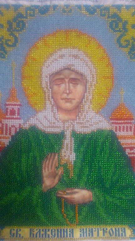Блаженная мати Матрона, душою на небеси перед престолом божьим предстоящи, телом на земле почивающи, данной ти с выше благодатью разные чудеса истоющи! И призри ты ныне милостивым твоим оком на нас, грешных, в болезнях, скорбях, бесовских искушениях дни свои иждивающих, утеши нас отчаянных, исцели недуги наши лютые, от бога по грехам нашим попущаемые, избави нас от множества обстояний и скорбей, умоли Господа нашего Иисуса Христа простить нам все наши прегрешения, грехопадения и беззакония, я же мы от юности нашей даже до настоящего дня и времени согрешимом, твоими молитвами получивши великую милость, мы прославим в троице единого Бога - Отца и Сына и Святого Духа, ныне и присно и во веки веков. Аминь…