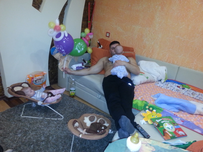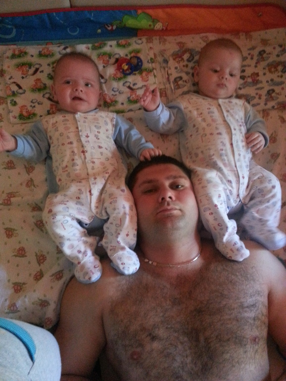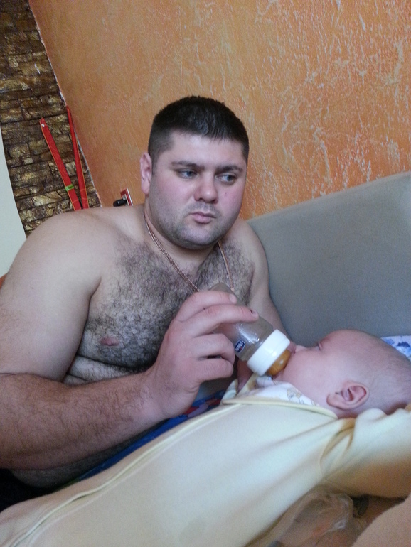 А это наш уставший папа)))) Мой герой любимый))) сейчас он получше выглядит!!!! В этот период мы оба прошли безсонные ночи... ибо он подавал малышей на ночное кормление 3- 4 раза за ночь... а утром в 5 утра после последнего кормления - на работу))) Кормит Темушку)))