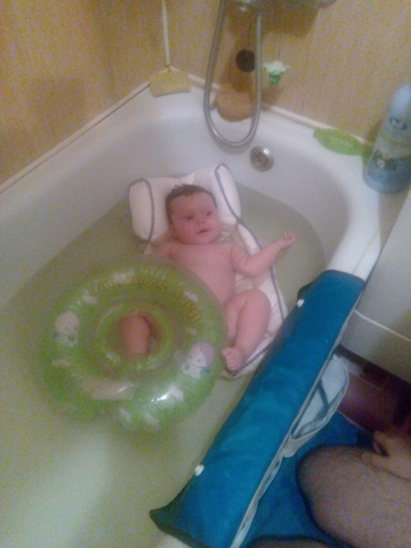 С поворотами на "суше" по тяжелее... Переворачивается только с живота на спину и то если в настроении. Если же нет настроя, то просто моськой бум и тишина, понятное дело, спешим перевернуть, чтоб не задохнулась.