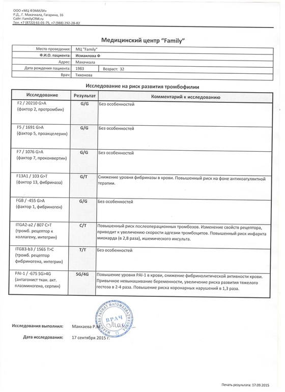 Вчера только была у врача))) самые главные анализы F2 и F5. У вас отклонений там нет, у меня тоже самое. мне врач объяснил, как смотреть: вот у вас в анализе F2 G>A, значит результат должен быть G/G (какой больше). У вас только в трех показателях маленько отклонения. Думаю врач тоже так скажет. Вчера слушала его взахлеб. Ну и конечно все анализы по крови берите с собой, он тоже их у меня смотрел))) Вот гомоцестеин у вас понижен, думаю здесь рекомендации от врача будут. У меня он в норме