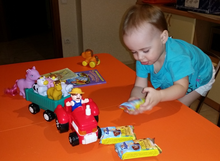 Самым первым дочка вытащила игрушечный тягач с фермером и животными в кузове (с музыкой и голосами животных). Ооо, вы бы видели эти восторженные глаза))) Остальное дочка вытаскивала из коробки одной только левой рукой, правой рукой прижимая к себе коробку с тягачом))))))) В посылочке еще были лошадка и коровка на колесиках, резиновая пони с шикарной гривой и расческой для нее (этим игрушкам тоже позже досталось внимание дочки - она и их в итоге загрузила в кузов тягача)))))))))), книжка со сказками, вкусняшки медвежонок Барни и открытка с новогодними поздравлениями)))):