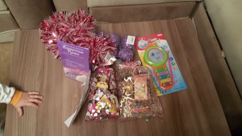 Только так я смогла затащить Свету домой! Подарки смотреть )))) коробку сразу вскрыли, и понеслось! Судьбу коробочки с киндерами видно на фото, Света даже сфотать не дала ))))