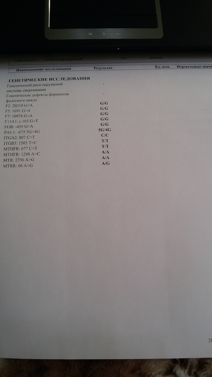 Гемостаз (+ИГ и ЛИТы)Всем привет! Девчульки выручайте! Заплатила за эти анализы 6 100 руб., ждала 10 дней пока сделают, сегодня получила результаты генетический исследований и..... Сижу, как баран на новые ворота смотрю, ни чего не понятно. Своему врачу отправила на электронку, жду ответа, скорее всего в понедельник получу ответ от нее. Но любопытство разбирает, всё ли хорошо по анализам? Может кто из вас сталкивался с подобной аброй-кодаброй, помогите пожалуйста понять, что к чему
