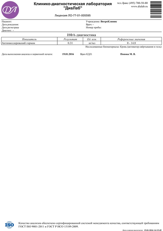 Год назад сдавала, все показатели были в норме, а АМГ даже выше нормы. Сегодня приходит результат 0,31 нг/мл. Причем, в норме лаборатории стоит от 0 до 14. В инете пишут от 1 до 10.... Может так резко упасть или это может быть ошибка лаборатории??? Никаких вмешательство не было, месячные регулярные как обычно... Фото под Кат