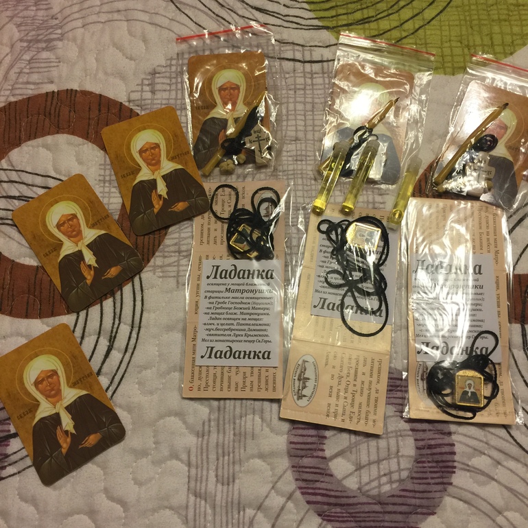 Девочки,съездила хорошо, все успела, и молебен о здравии Матроне заказать всем, кто писал, и записочки оставить у её мощей, и даже на помазывание попали) Купила там несколько ладанок освещённых,иконки,маслице освященное. Девочки, кому выслать что-то? Пишите в личку адреса. И, конечно, в приоритете те, кто далеко и не может приехать лично поклониться Матроне.