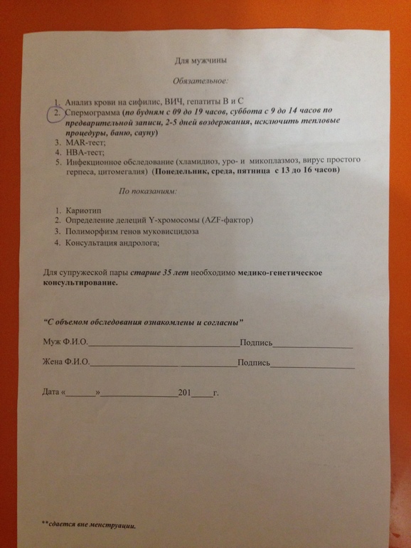 Этот список анализов мне дал репродуктолог в МОНИИАГе, при моем первом посещении. И кружочком обвела те анализы, результаты которых мне нужно было принести ей на следующий прием. В моем случае нужно было не так много анализов сдать - так как у меня ситуация понятная была - ЖФ.