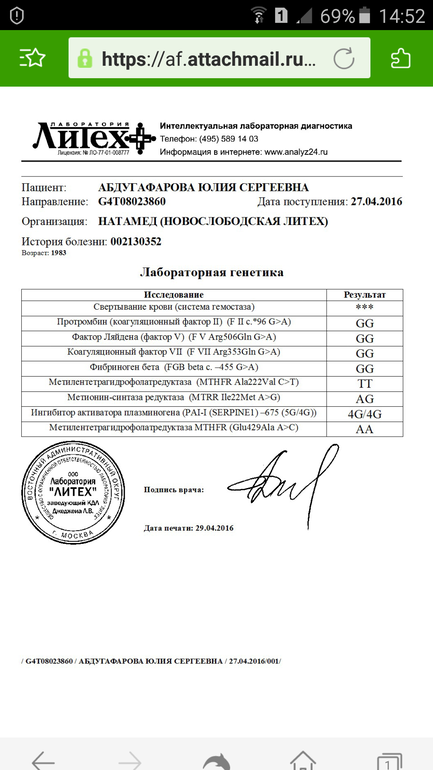 Обратите внимание на пай ген, если гомозигота, необходимо соблюдать все назначения врача по количеству препаратов разжижающих кровь(в основном фраксипарин) и ни в коем случае не пренебрегать этим