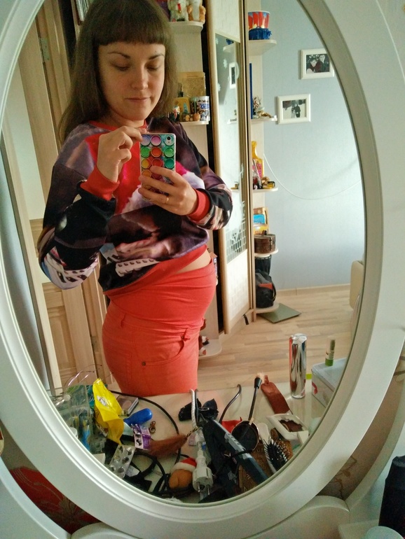 Живот стал появляться с 16 недели, как-то вдруг. Но все-равно, видимо, это зависит от положения детеныша или от количества сьеденного в обед, выглядит по-разному. Общая прибавка в весе чуть меньше килограмма.