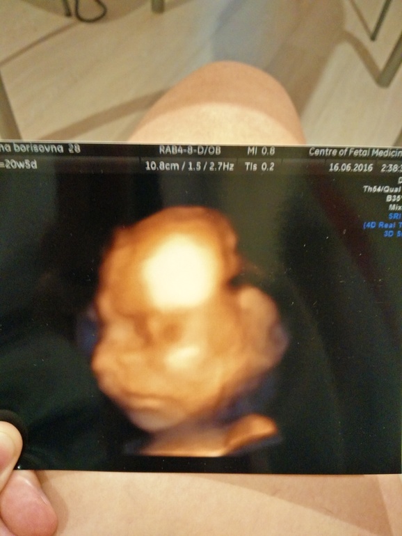 Сегодня прошла второй скрининг. Делала в Центре медицины плода на Ваське у Порозовой Е.Н. Идём срок в срок. Все в норме. Только пока все ещё плацента низко, ну хоть зев не перекрывает, только подходит к нему вплотную. Но я уверена, что она вскоре поднимется)) Сын оказался с характером. Категорически отказывался позировать. Меня промурыжили 2 (!!!!!!) часа. Лежал все время неудобно. Не давал смотреть лицо, сердце. Убегал от датчика. Два раза погулять отправляли. Шоколадом кормили (сразу воды стал глотать))))) 361 грамм живого веса, а вредности .... Ну весь в отца)) И фоткаться, как и он, не любит, поэтому 3D (с 4ой попытки) получилась мягко говоря не очень. И ещё у нас, кажется, римский профиль... Нос мужа кажется... Ну для мальчика сойдёт. А вообще, доктор сказала, что по этому 3D не стоит оценивать и предполагать внешность)) Прилагаю фото себя и сынули.