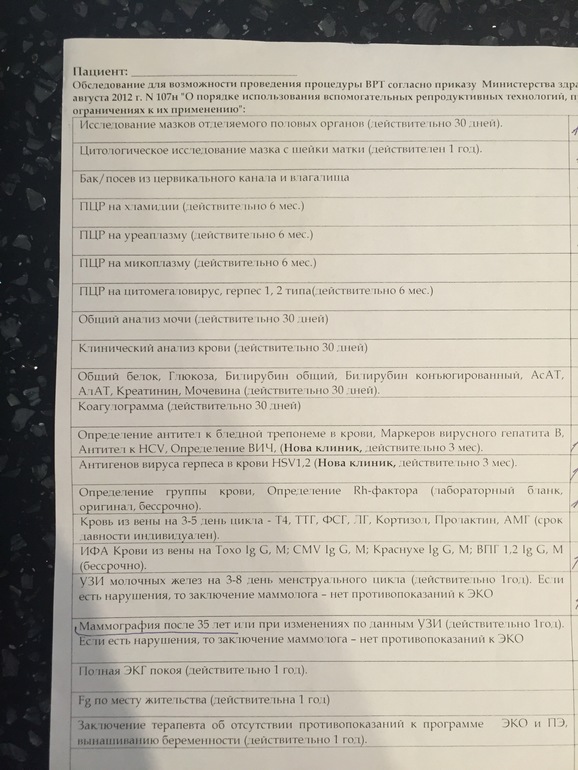 Зайдите на сайт вашей клинике и найдите перечень анализов, затем позвоните и уточните актуален ли этот перечень, сдайте все, готовые результаты возьмите на первичный приём, я так делала, через 2 недели была уже в протоколе.