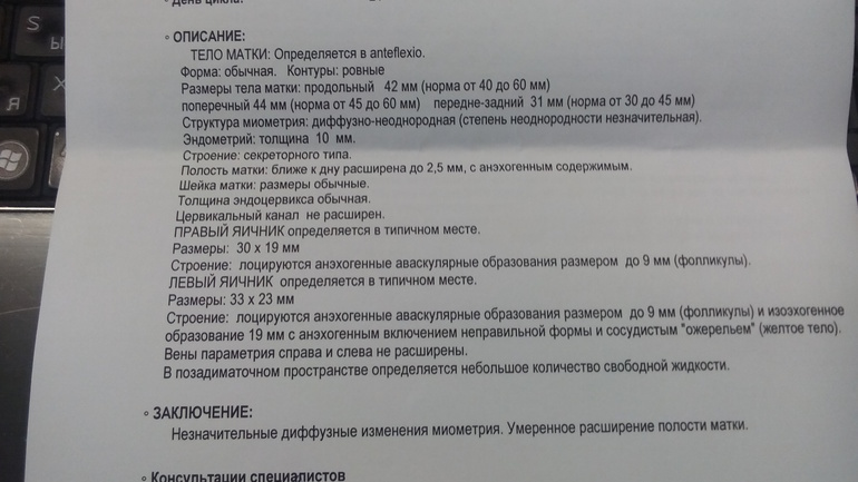 У вас была овуляция, написано желтое тело 19 мм, жидкость осталась после овуляции, скоро рассосется. И эндометрий у вас очень хороший, пышный, тем более после овули эндометрий уплотняется уменьшается, у вас как раз для имплантации эндик.