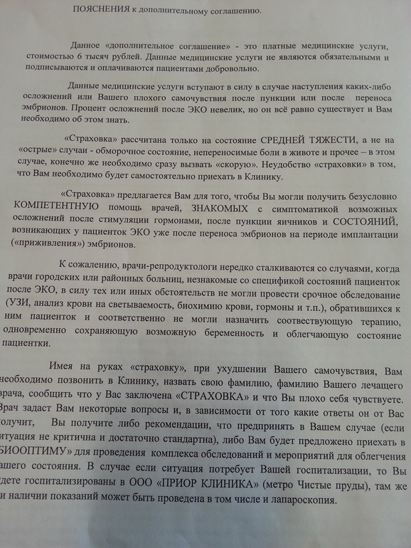 ЭКО по квоте и полису ОМСДоброе Утро! В пятницу едем подписывать договора в Биооптиму на ЭКО по квоте. Документы дали на руки за ранее изучить. Приложили дополнительное соглашение на оказание платных мед услуг стоимостью 6000 руб. Я так поняла при осложнениях после пункции или после переноса эмбрионов, оказывают помощь в пределах до 70 000 руб.