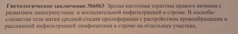 На лапаре мне удаляли тератому и прижигали эндометриоз. А вот по гистологии никто ничего не объяснил и я почему-то решила, что все ок. А все ли было ОК? кто-нибудь может перевести второе предложение? И может ли это как -то быть связано с гиперплазией?