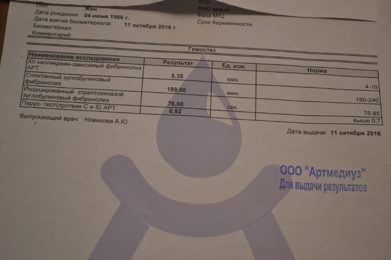 Вчера была на приеме у гематолога (в этой же платной ЖК), ну и назначили фраксипарин, магникор. Перед там как колоться решила я перепроверить, и перепроверила. В другой лабе таких проблем у меня нет (результат ниже). Завтра пойду еще в 3-ю лабораторию пересдам.