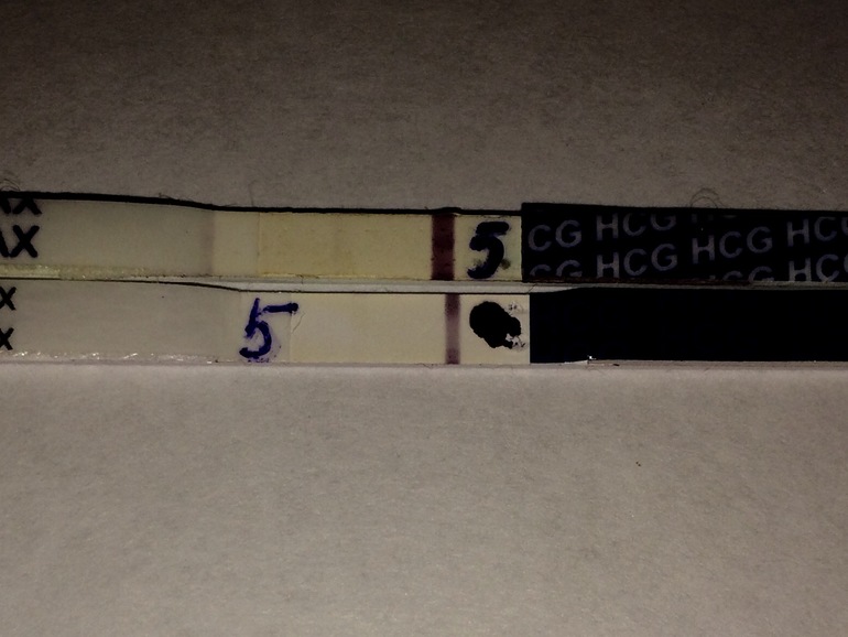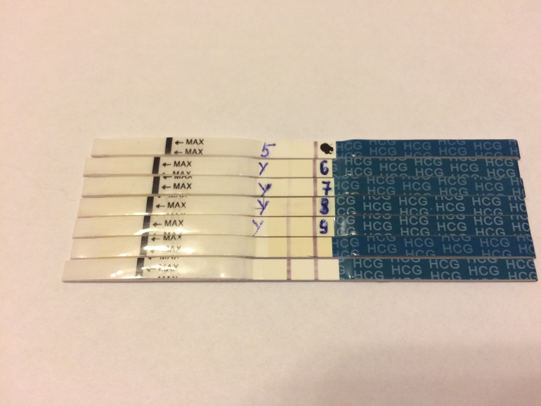 У меня на 5 дпп утренний фрау показал едва видный призрак , я сразу же после этого сбегала в аптеку и накупила эвиков, замочила ,эвик показал еле-еле видную только мне ,и то только на чистом листе а4 , но полоска была толстенькая по ширине и полностью прокрашена , я сразу поняла ,что это начало . На 6 дпп эвик утренний показал уже более явную и я уверилась , что все получилось . Сейчас найду фото , выложу динамику ,если вам интересно .