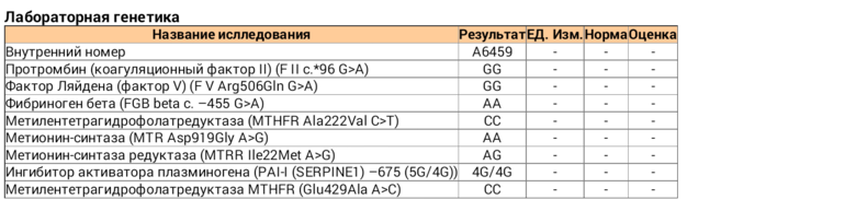 Фибриноген (hom), MTHFR (hom), MTRR (het), PAI (hom)