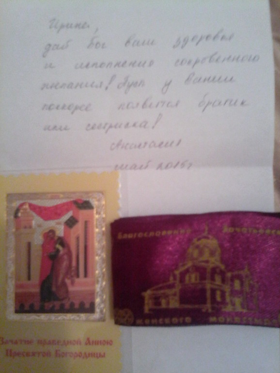 Просим о ЧУДЕ // (молитвы,записочки)Я такая счастливая! Вчера получила письмо из Москвы от Анастасии (пост) с иконой "Зачатие праведной Анною Пресвятой Богородицы" и освященный поясок. Боже, какое всё красивое! Очень верю, что Бог, Богородица и её святые родители - Иоаким и Анна помогут мне легко зачать, благополучно выносить и родить в срок здоровенького малыша!