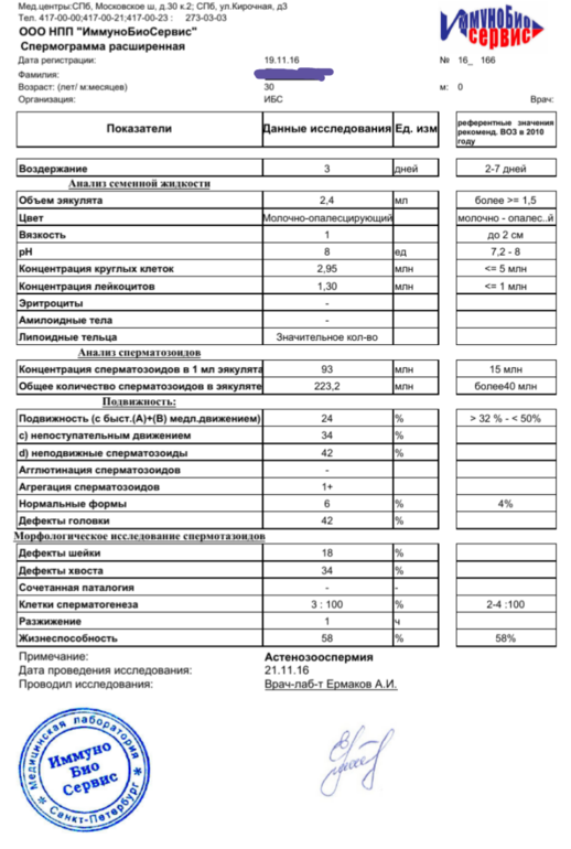 Если Вы из СПб, то советую: мне мой врач сказала все анализы сдавать только в НИИ Отта. Лаборатории косячат( У мужа подвижность в Мед Лабе поставили 4,8% класс А, общая -27%. Может из-за спермапланта и правильного образа жизни, но сегодня пересдали в Отта - класс А - 45%, общая - 55,9%. Разница между анализами около 2 мес, добавили витамины и спермаплант.